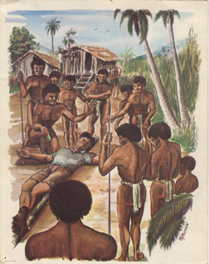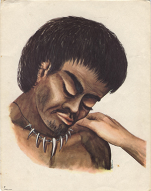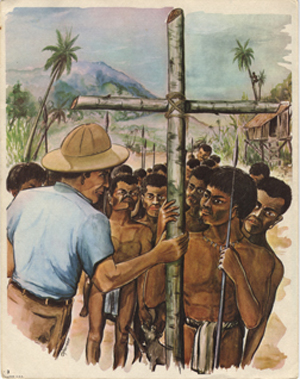 The pamphlet relates the “true story” of missionary Hubert Mitchell and his attempts to communicate the gospel to the Kubu people of Sumatra in 1937. Likely published in the late 1950s, the text exhibits the paternalistic attitudes of its day, describing the indigenous population as “primitive” and “uncivilized” people, “extremely shy and isolated but quite peaceable.” Alongside the narrative, the pamphlet also includes a brief profile of Sumatra, describing its climate, flora, fauna, and indigenous cultures in idyllic terms, and mistakenly locates the island “300 miles due east of Borneo” rather than west.