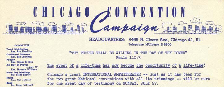 The event of a lifetime has become the opportunity of a lifetime!” So claimed the flashy mass marketing letter inviting one and all to the Chicago Convention Campaign. Spearheaded by Torrey Johnson, the tireless president of Youth for Christ, and drawing widespread support from churches and religious leaders across the Upper Midwest, the 1952 Convention Campaign offers a glimpse into mid-century mass evangelism efforts, particularly the potent combination of evangelistic and patriotic fervor.