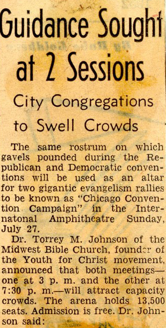 These clippings, photographs, posters, and more are held in Collection 285: Papers of Torrey Johnson at the Wheaton College Billy Graham Center Archives.