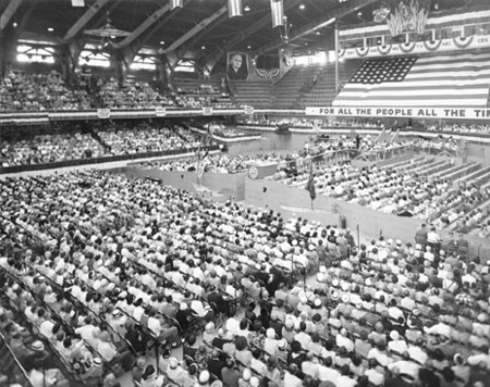 Photographs of the Chicago Convention Campaign confirm Torrey Johnson’s prediction of “capacity crowds.” Several remnants of the previous day’s Convention remain in evidence, including the Democratic party insignia on the podium, massive American flag, the banner reading “For All The People All The Time,” and the portrait of Harry S. Truman, currently serving as the 33rd president of the United States, hanging from the rafters.