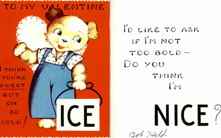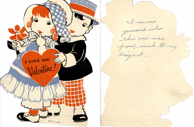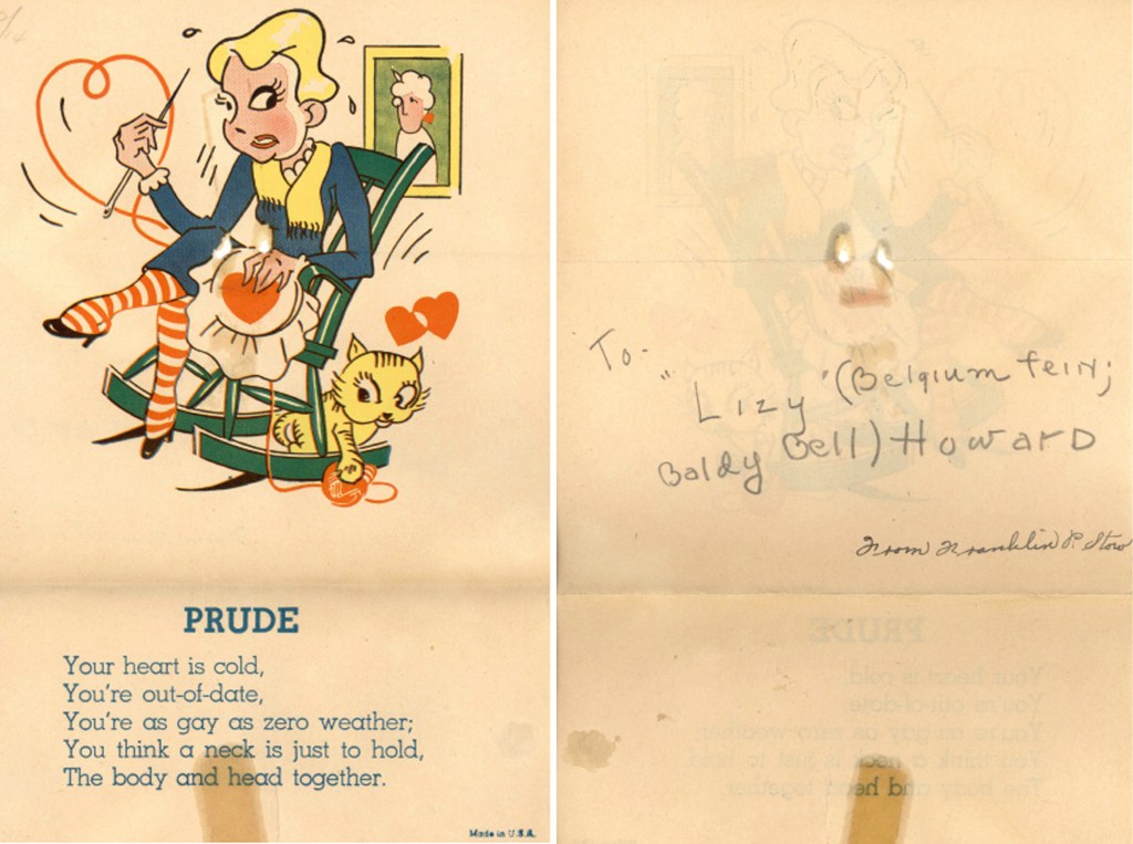 These Valentine cards are a wonderful reflection of American attitudes toward love and friendship in the 1940s and some of the ways the vocabulary and expressions surrounding the holiday have changed in the past 80 years. As can be seen in these examples, Valentine cards could contain some sharp ribbing as well as sweet sentiments. Because Elliot’s later notes are sometimes hard to read, where they occur there is a transcript below the image. The original Valentine cards can be found in Collection 278, Box 8.