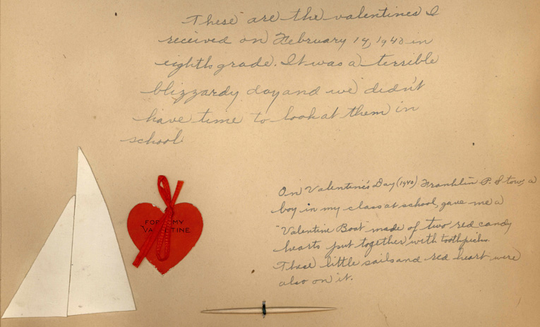 As an adult, Elliot annotated the Memory Book in her elegant script, recalling “These are the valentines I received on February 14, 1940 in the eighth grade. It was a terrible blizzardy day and we didn’t have time to look at them in school.”