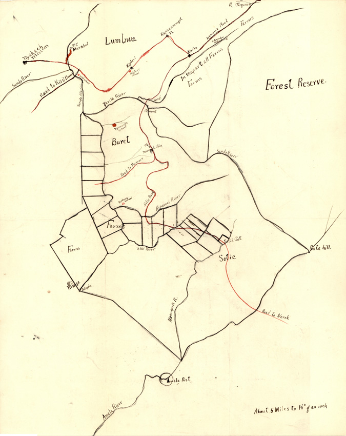 The anonymous cartographer is especially concerned with documenting the location of local landmarks—rivers, roads, and particularly agricultural sites. While the map is carefully drawn and neatly labeled, the creator also used breezy generalizations, like “In this part all Farms.” At 13×16 inches, the map is small enough to be hand-held and was likely intended for internal use by the Litein Station staff members. Although the document does not include a key to explain the differences between the red and black ink roads or dots, it does highlight several AIM-related locations, including the “Nyakach Mission” on the far upper left corner and the “Amala Post” centered at the bottom of the document.