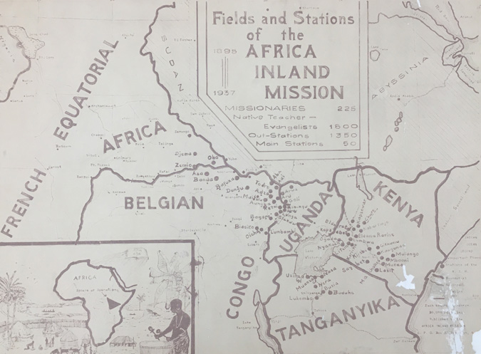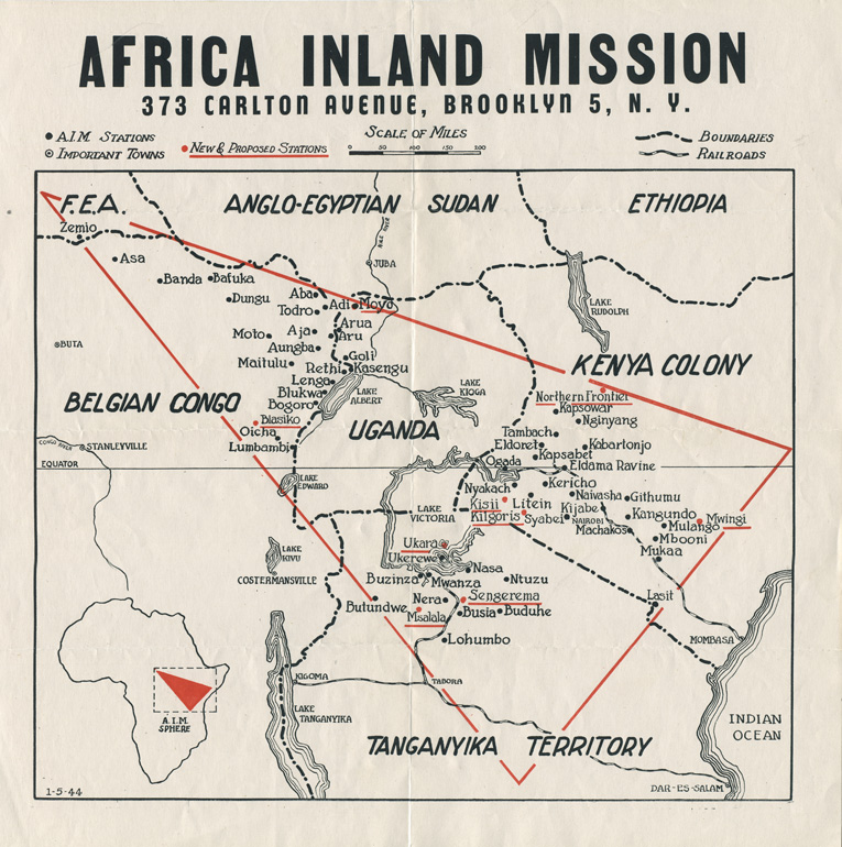This month, the Archives commemorates 125 years of Africa Inland Mission (AIM) and traces its development in East Africa through a series of maps held in Collection 81: Records of Africa Inland Mission. Created by AIM staff and missionaries, these items overwhelmingly reflect the perspectives of Western missionaries and the European colonial powers that occupied the African continent in the twentieth century. The maps featured below tell an incomplete story—spanning only seven of the thirteen decades that Africa Inland Mission has operated in East Africa—but they do begin to suggest the stories behind the ink, images, and text, and illustrate the growth of the African church and the lives of missionaries who served there.