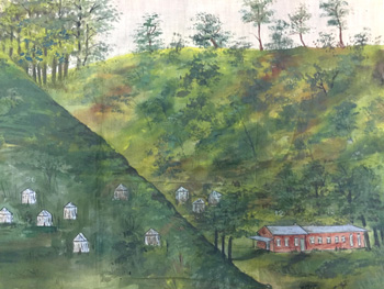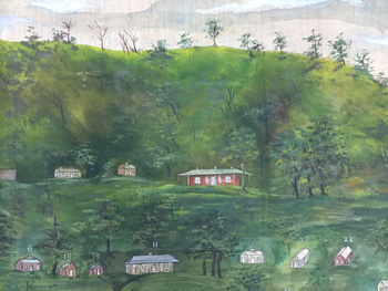 This vibrantly-colored map is likely one of the earliest representations of the AIM headquarters. Along the bottom of the painting is a key, indicating the nature of the various buildings and sites in the painting. The key is incomplete or unclear however—some of the numbers do not appear on any buildings, and some of buildings have no numbers. A close examination of the painting also shows some numbers have been partially erased.
