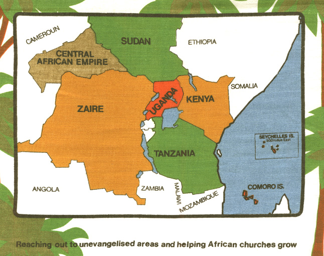 This final map is an excellent example of melding form and function, eschewing an oversize paper-based medium for a durable textile format. Designed as a colorful tea towel on white “Irish linen,” this map serves a dual purpose, merging a practical household items with marketing strategy. The towel illustrates in bold colors AIM’s current ministry sphere (notice that the Seychelles and Comoros Islands have been added since 1975) and proclaiming AIM’s mission statement: “Reaching out to unevangelized areas and helping African churches grow.” It is possible that functional map-towels like this one were given to AIM supporters in the United States as a tangible reminder to pray for AIM missionaries and ministry efforts.