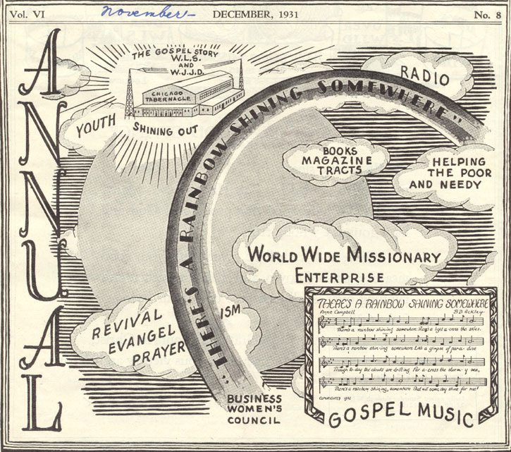 Rader was the very model of a modern Evangelical evangelistic entrepreneur, using popular culture and current technology to transmit the Gospel. Rader’s evangelistic radio broadcasts, among the first of their kind, began the same time as the Tabernacle. By 1925 he was broadcasting sermons and music fifteen hours every Sunday. Listeners were encouraged to write in to receive giveaways such as phonograph records and calendars. Besides this Sunday morning programming, Rader also developed a weekday morning program.