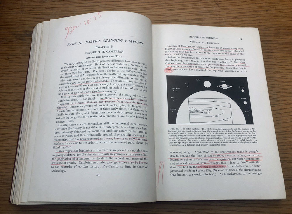 The texts are full of the vigorous underlining and highlighting typical of college students. Almost all the accompanying notes are summaries of key points from the textbook. The once exception occurs on a page introducing the pre-Cambrian history of earth, where a penciled reference to Genesis 10:25 appears, “Two sons were born to Eber: One was named Peleg, because in his time the earth was divided; his brother was named Joktan” (NIV).