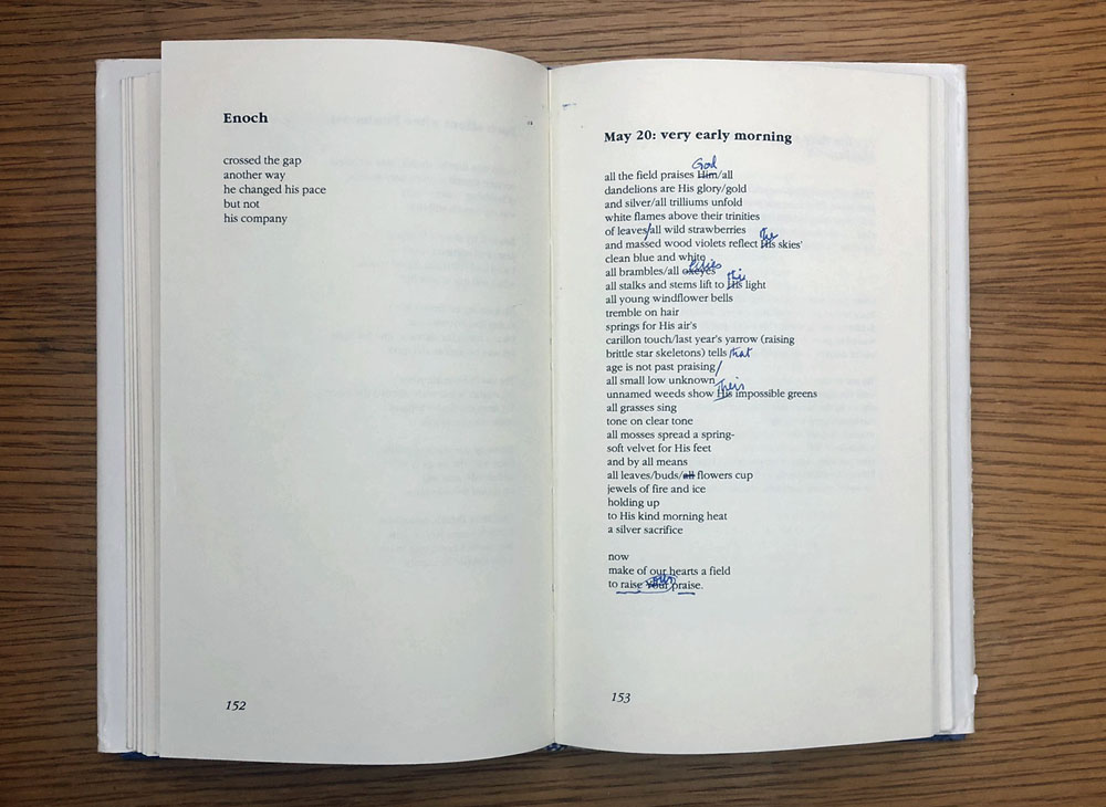 Although many examples of marginalia illustrate the reaction of a reader to a set text, others show how a work itself may change over time. The below example, from the poet and author Luci Shaw’s Polishing the Petoskey Stone (1990), includes the author’s notes and revisions on her own poem. Possibly made for public readings or new editions, they present a picture of a text in continual progress, as well as the ongoing relationship between an author and her work.