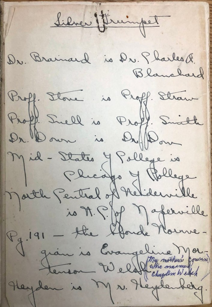 One copy of Silver Trumpet held by Archives & Special Collections provides a view of this lost contemporary reception. Originally owned by another Wheaton student of the era, Jean Mortenson, the copy includes Mortenson’s notes of her thoughts on the real-world counterparts that might have inspired some of the characters and places of Ingles’ fictional account.