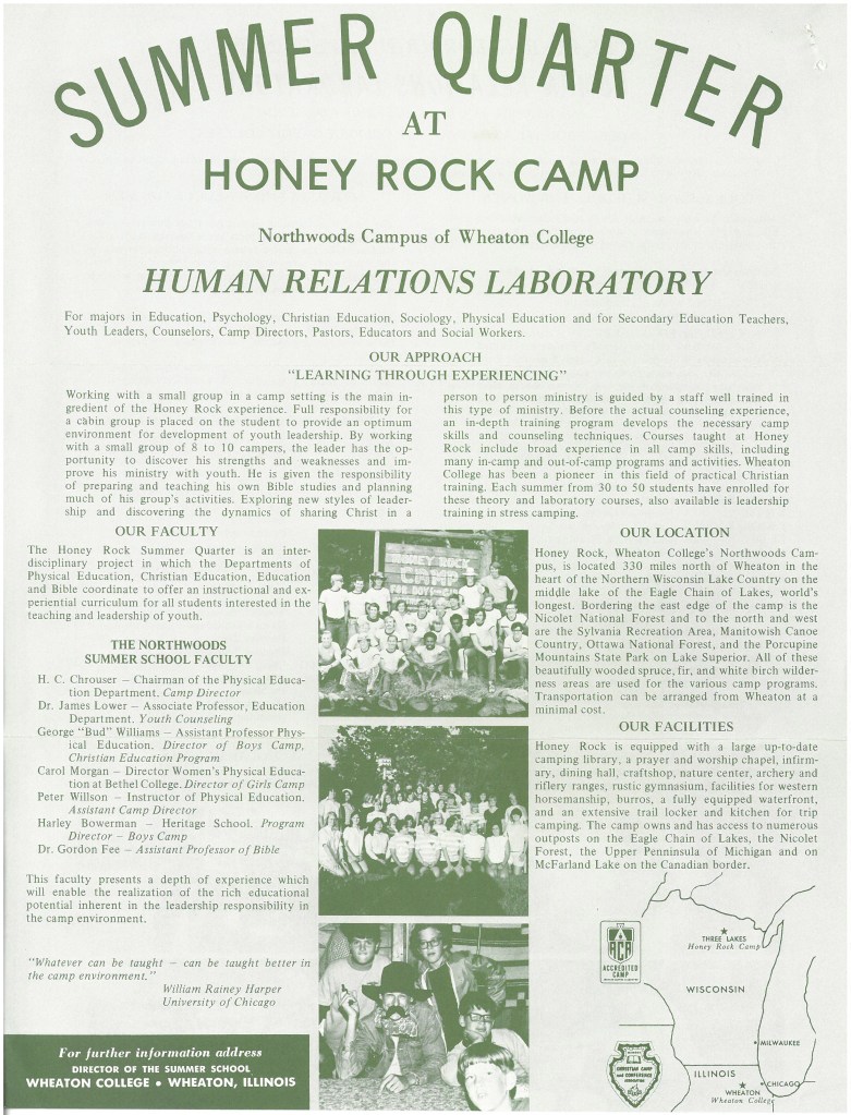 Founded in 1951 as Honey Rock Camp, the program engaged Wheaton students in practical leadership skills through work as summer camp counselors for elementary and high school kids in the Chicago area. Wheaton Archives & Special Collections holds many photographs, scrapbooks, and records on the development of the camp from its beginnings as a summer program to the current full-year schedule, including several oral history interviews with former students, faculty, and staff.