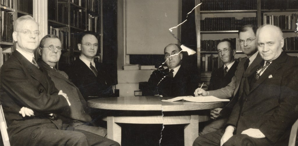 McCarrell (second from left) sits with some of the Board of Trustees, c. 1935. L to R: Edgar Dival, William R. McCarrell, J. Oliver Buswell, Jr., Herman Fisher, Jr., George V. Kirk, Foster Oury. (College Archive Photograph A0489)