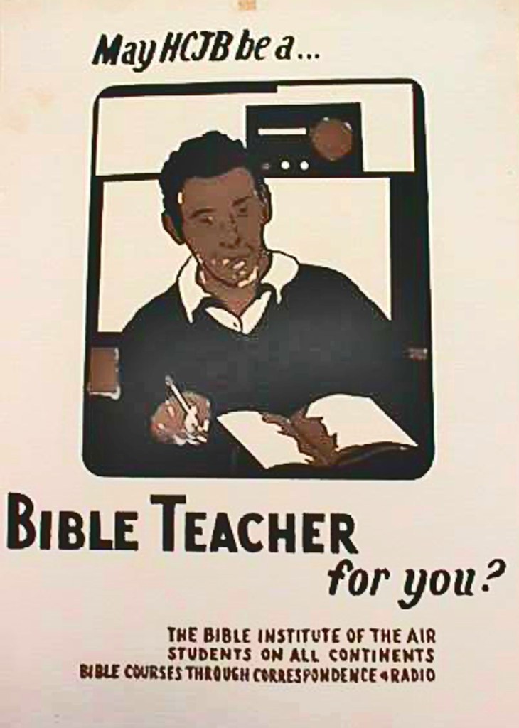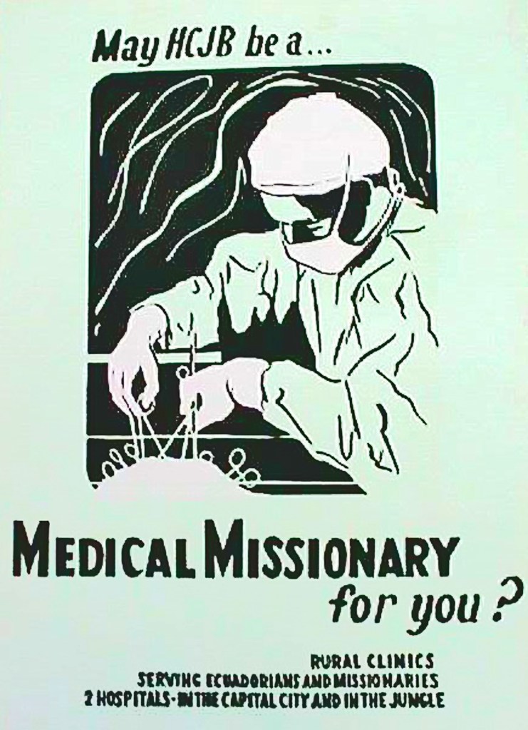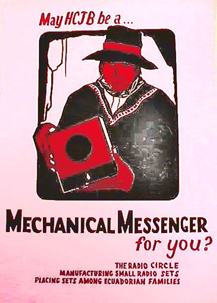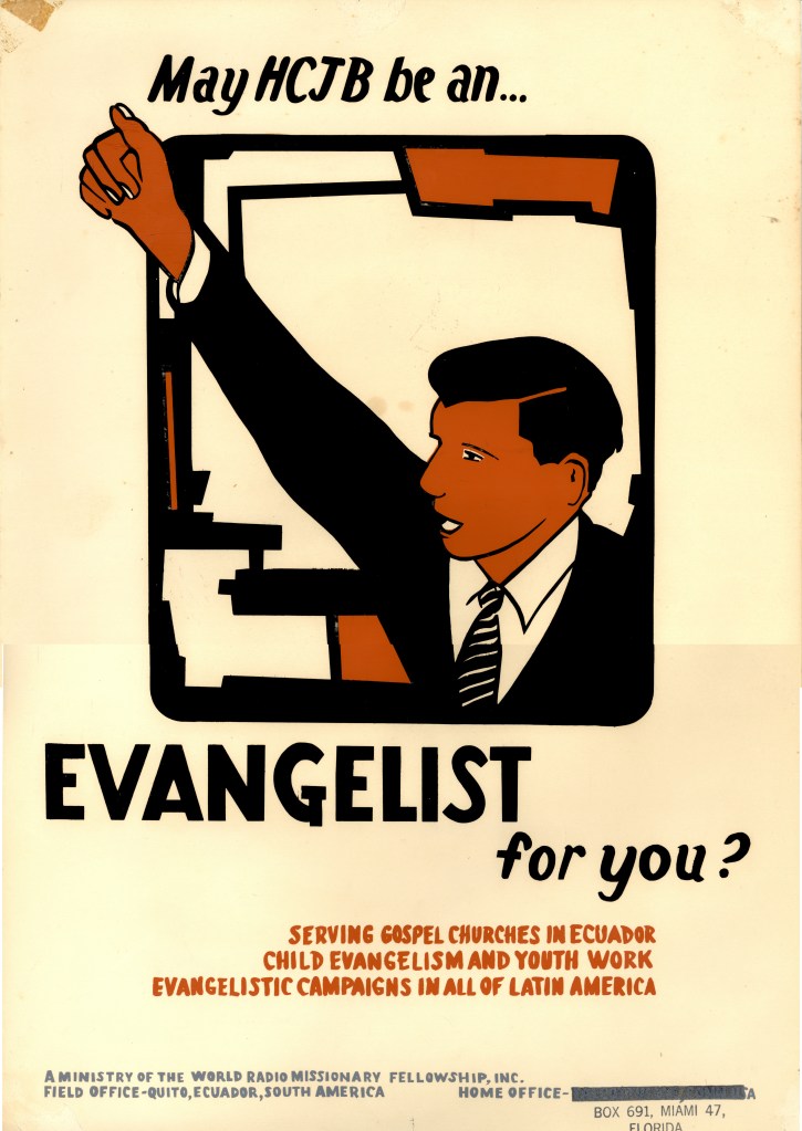 An even better example is the striking series of five posters below, from the Clarence Jones papers in Collection 349. They show the growing variety of HCJB’s work in Latin America. But they were not directed to the station’s primary audience in Ecuador. Rather, as shown by their English language text, they were intended for churches and other Christian audiences in the United States, encouraging American Christians to support ministry and missionary work in South America through their surrogate of HCJB.