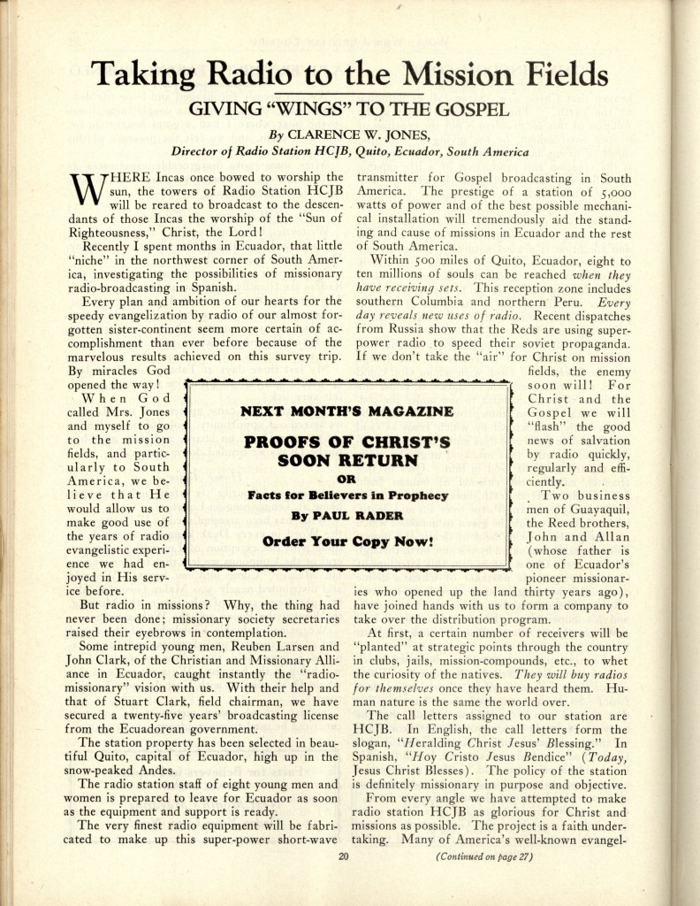On Christmas Day 1931, Jones and Larson began broadcasting from the converted sheep-shed at Quinta Corston in Quito, Ecuador that housed their brand new station HCJB. In Spanish, the call letters meant “Hoy Christo Jesus Bendice” (Today Jesus Christ Blesses) and in English “Heralding Christ Jesus’ Blessings.”