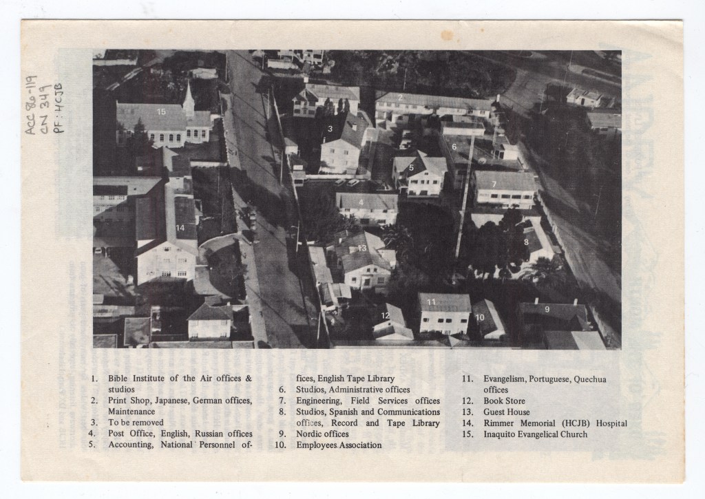 HCJB’s case is typical of many Evangelical foreign missions that found their major base for money and personnel in the twentieth century in American churches. Find out more about HCJB and its connection to American, and especially Chicago churches, through Collection 330: Records of Moody Church, Collection 349: Papers of Clarence Jones, and Collection 86: Records of the International Broadcasting Association, as well as oral history interviews with HCJB workers Americo Saavedra, Sally Bell, Robert Savage, and Curtis Cole.