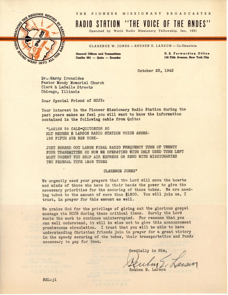 Particularly in its early years, HCJB continued to draw heavily on support from the United States, as seen, for example, in this letter from the WCBGC Archives’ Collection 330: Records of Moody Memorial Church. The letter was written by Larson to H.A. Ironside, pastor of the Moody Church in Chicago (Box 9, Folder 9):
