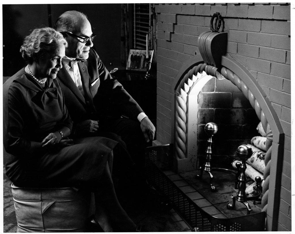 Dr. V. Raymond Edman and Edith, “friend wife,” sit comfortably before a blazing hearth – or rather, a cold fireplace with an electric lamp lit from within, since there is no actual flame. This photo was published on the cover of Wheaton Alumni magazine, December, 1961.