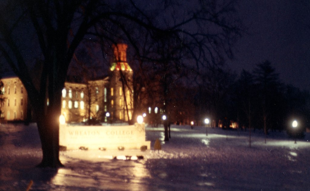 Christmas at Wheaton was not just contained to the campus. Beginning in 1950, the city of Wheaton invited the art department of Wheaton College to construct a display on the corner of Wesley and Main. In 1967, the department installed a somewhat abstract manger scene in Adams Park, highlighted by bright spotlights. Reviewing their efforts, Miriam Hunter, assistant art professor, reflected, “The purpose is to display the glory and sovereignty of God.”
