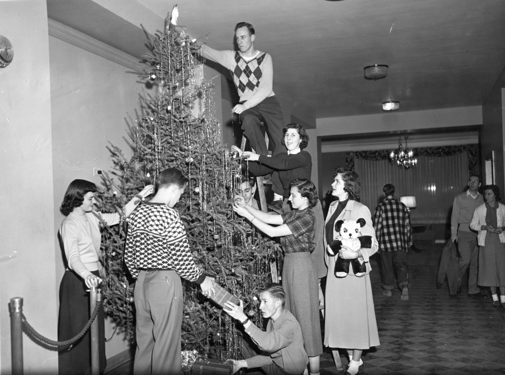 Students decorate a very tall Christmas tree situated in a hallway in the Memorial Student Center (1951).