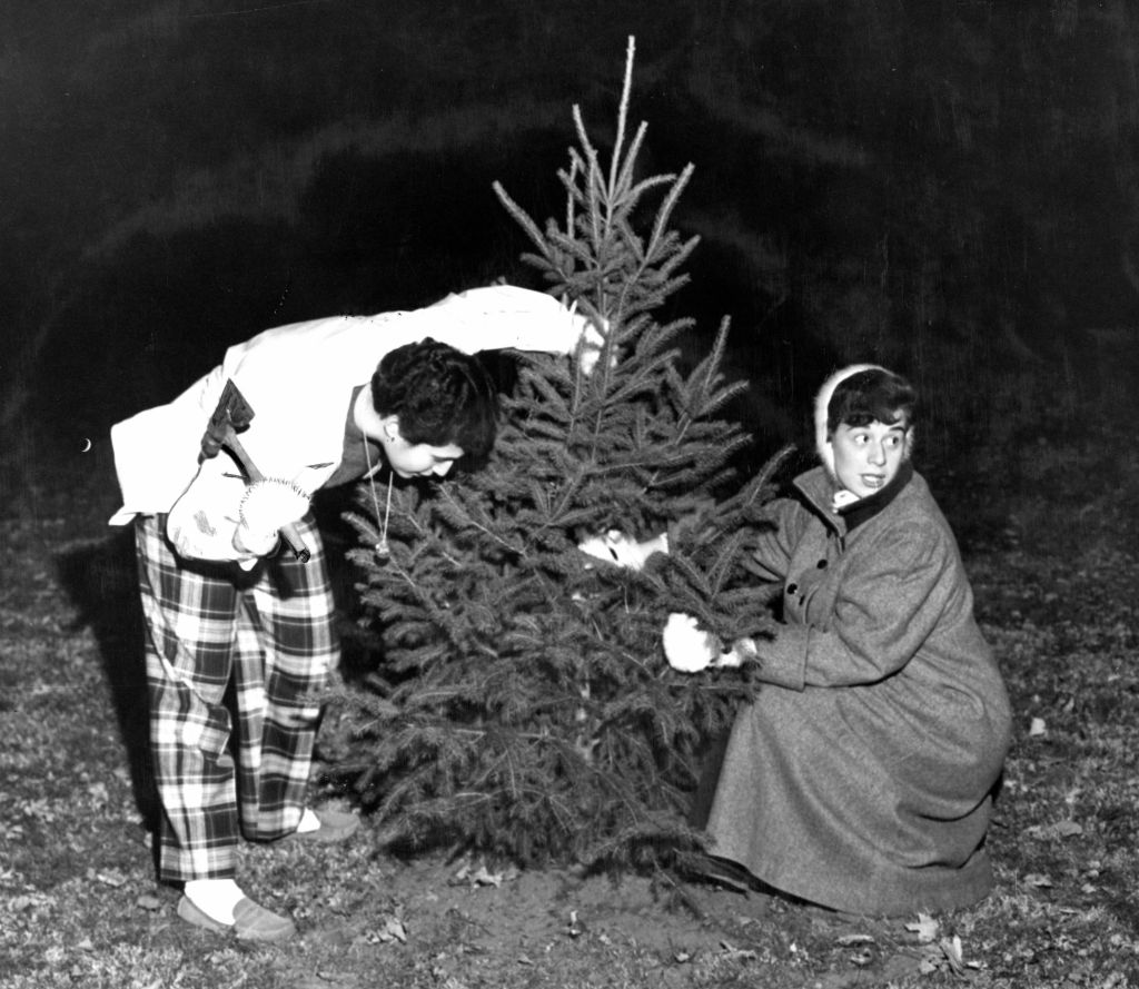 Two Wheaton College students prepare to cut down a tree, or pretend to do so. The angle of the hatchet, and the stance of the girl, might be insufficient for the task, c. 1955.