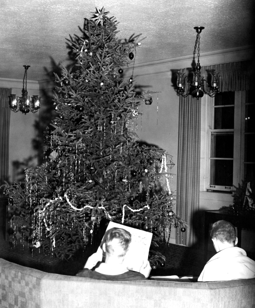 Two students relax before another very tall tree, probably displayed in the Memorial Student Center, c. 1955.