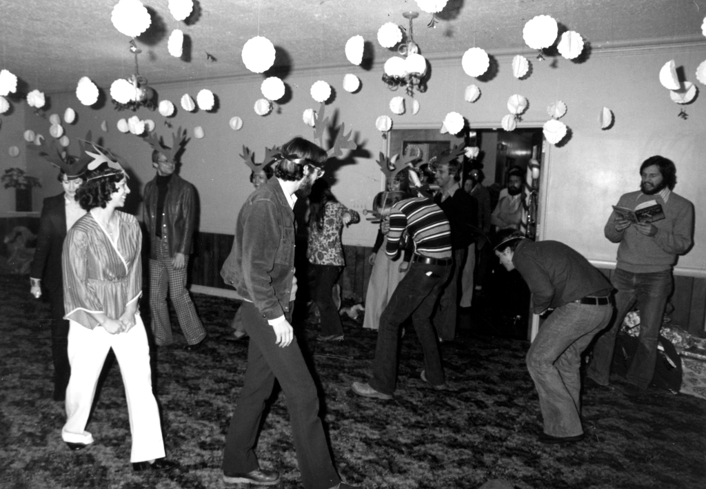 It is not all serious business in the Graduate School. These students, wearing reindeer horns, march in game during a Christmas celebration, c. 1978.