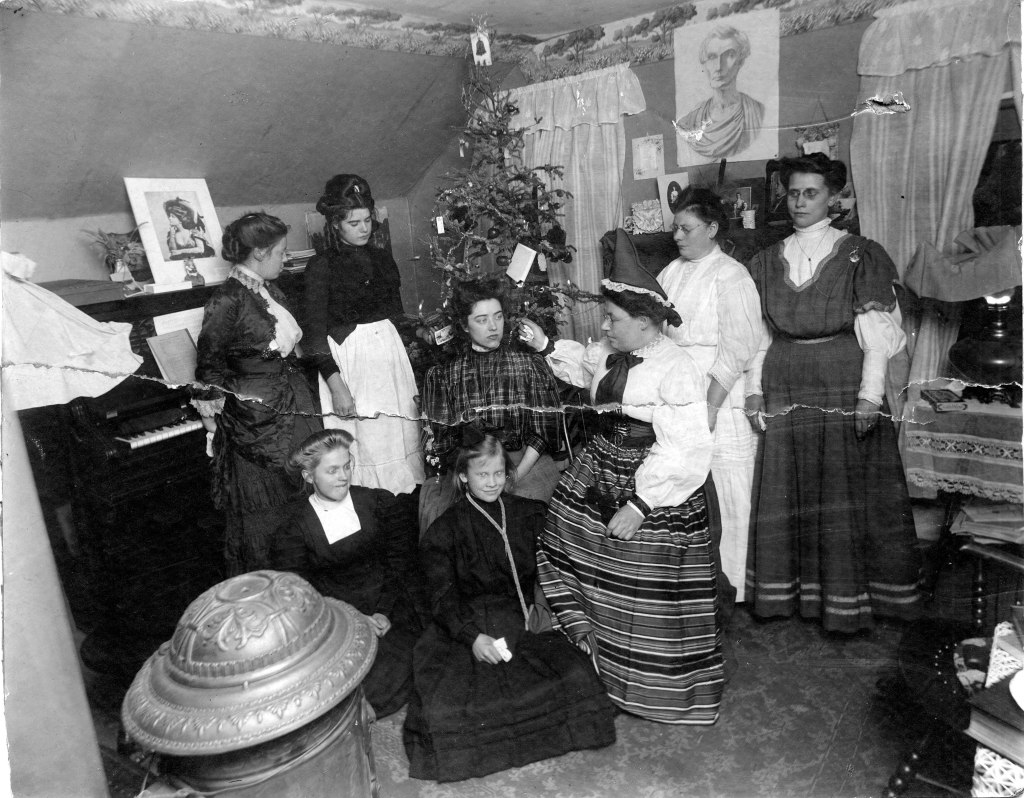 Wheaton College students celebrate Christmas in their dormitory, c. 1900.