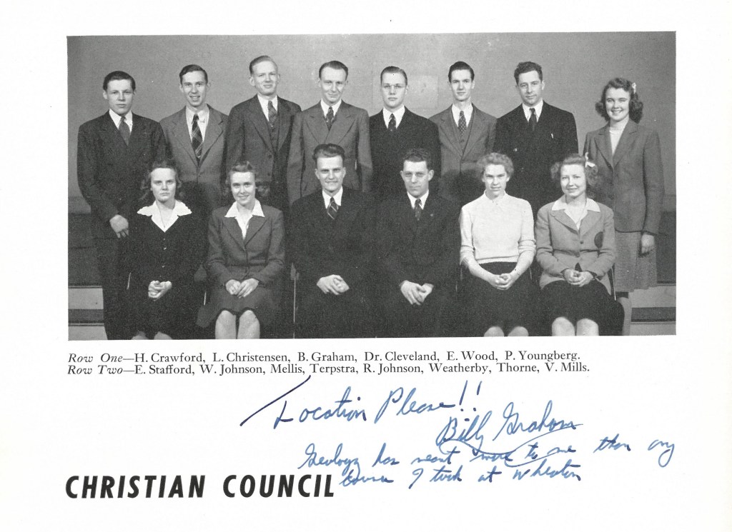 At Wheaton, Graham jumped heartily into the life of a college student at a liberal arts institution. Under the influence of a beloved Wheaton professor, Dr. Anthony Grigolia, he majored not in Bible but in the newly introduced program of Anthropology. He tried other things as well, including a very brief and unsuccessful career as a college wrestler, and a stab at campus theatrics, with a small part in Macbeth. During his senior year he became president of the Christian Service Council, leading student gospel teams to churches and missions across Chicago and the Western suburbs.