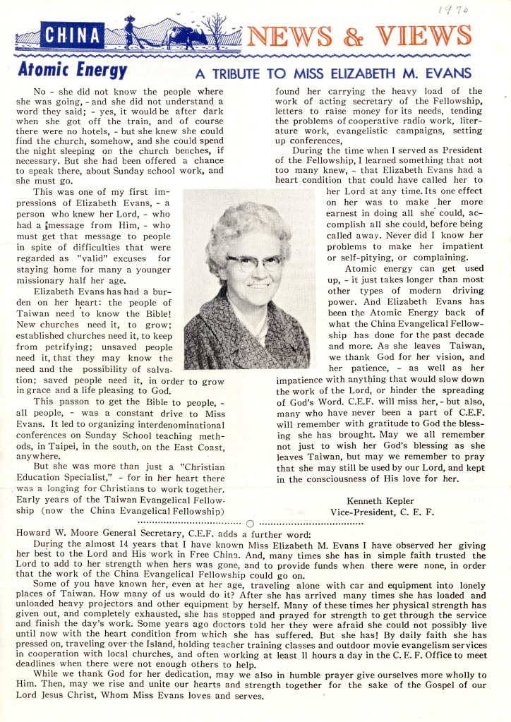 Archives & Special Collections holds seven and a half hours of interviews with Elizabeth about her life, including online audio files and transcripts (Collection 279). In these interviews Evans, besides talking about her own work, gives personal vignettes of many Evangelical leaders of the 1940s, 50s, and 60s. There are also several boxes of correspondence, folders, lesson plans, magazines and other materials that are unprocessed but open to researchers. These document Elizabeth’s remarkable life and her contacts with a host of Evangelical leaders in the United States and other countries.