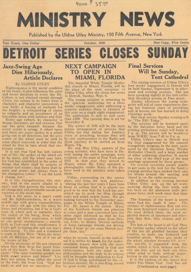 Uldine Utley in the 1920s and 1930s was one of the better-known evangelists in the United States. Beginning to preach at the age of twelve, she would eventually hold meeting in Madison Square Garden in New York. In 2023, her family gave the Archives her papers (Acc. 2023-033), including sermon manuscripts, pamphlets, books, photographs, posters, and a scrapbook of ephemera from her campaigns.