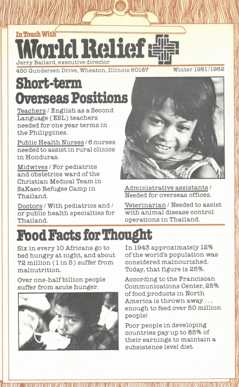 A core collection in the Archives & Special Collections received a significant addition in 2023. Held in Special Collections, the National Association of Evangelicals records includes the files of the World Relief Commission, founded in 1944 to respond to the aftermath of World War II. This past fall, the Archives received more than 50 boxes of administrative records, photographs, and other media, spanning World Relief’s work around the globe in the 1980s, ’90s, and early 2000s. This acquisition will be opened for research in the coming year.
