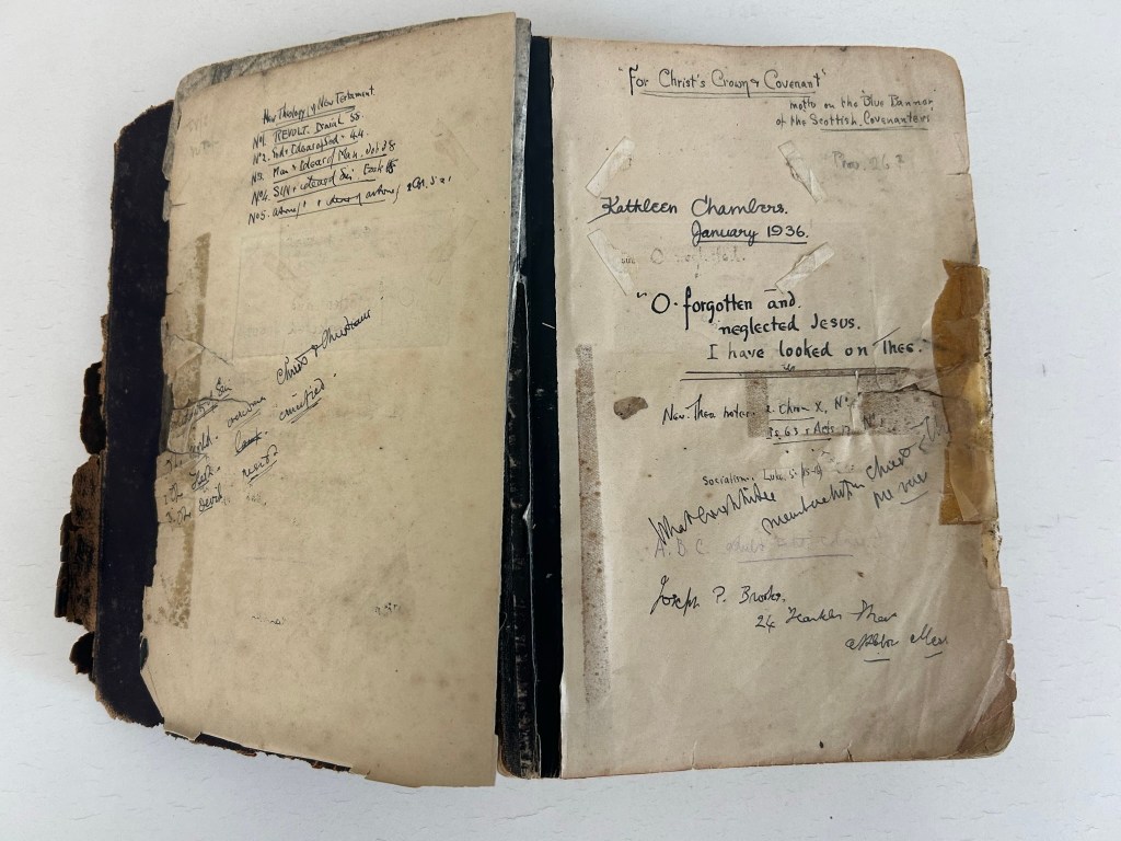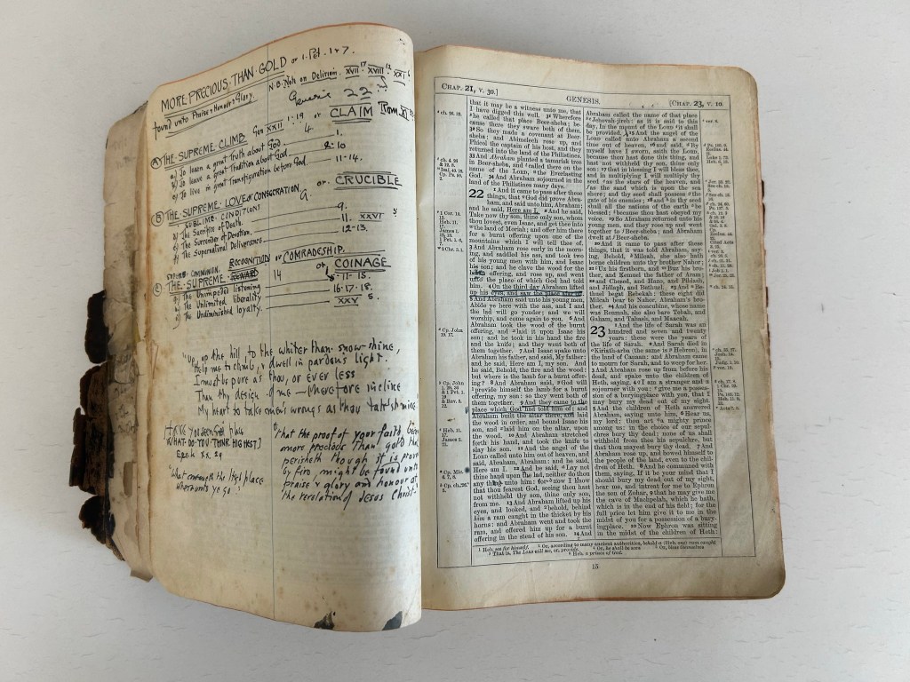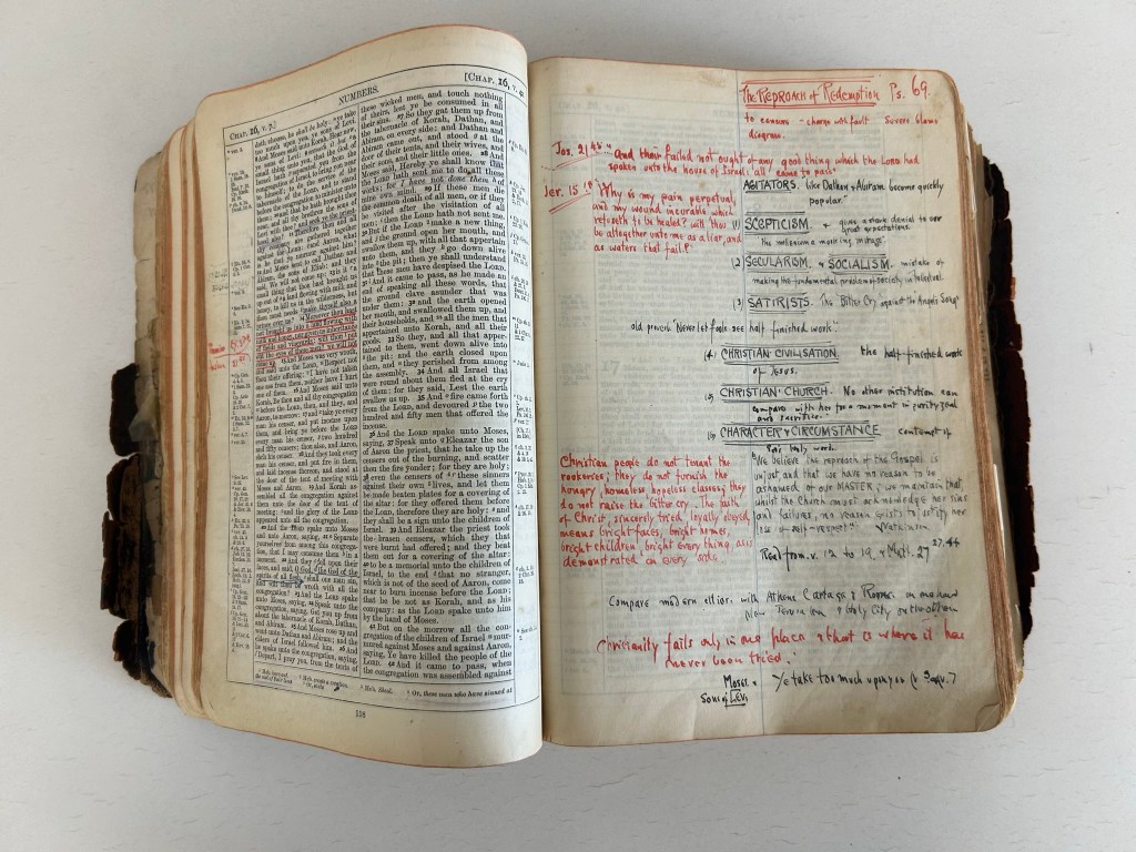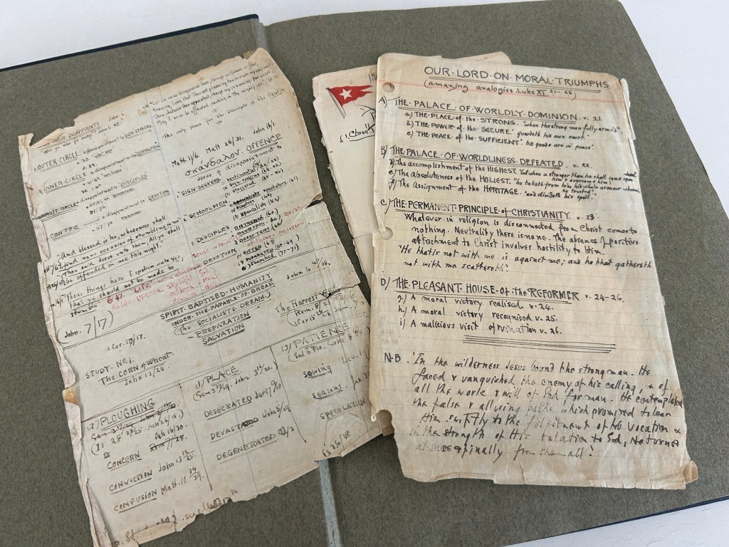 Of special interest are the class notes and personal diaries of Eva Spink—a student of Chambers’ at the Bible Training College in London and a co-worker in Egypt—and a Bible used by Oswald Chambers in the early 20th century filled with his extensive annotations.