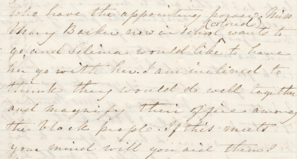 Of Mary’s ambitions after her education, we have only a secondhand record. In an 1863 letter to her husband, Jonathan, Mary Blanchard mentions that Mary Barker desires to be a missionary in the South: “By the way Selima [Blanchard] told me last Sabbath after Mr. Markham’s sermon (which was pretty good) that she has always wished to be a missionary and she should love to go and teach the contrabands [formerly enslaved people]. . . . Miss Mary Barker now in school (colored) [sic] wants to go with her. I am inclined to think they would do well together and magnify their office among black people.” A subsequent reply from Jonathan reported writing to family connections on the East Coast about soliciting a place for Selima Blanchard and Mary Barker to serve as teachers among the “freed blacks,” but professed his personal doubts about the chances of their employment.