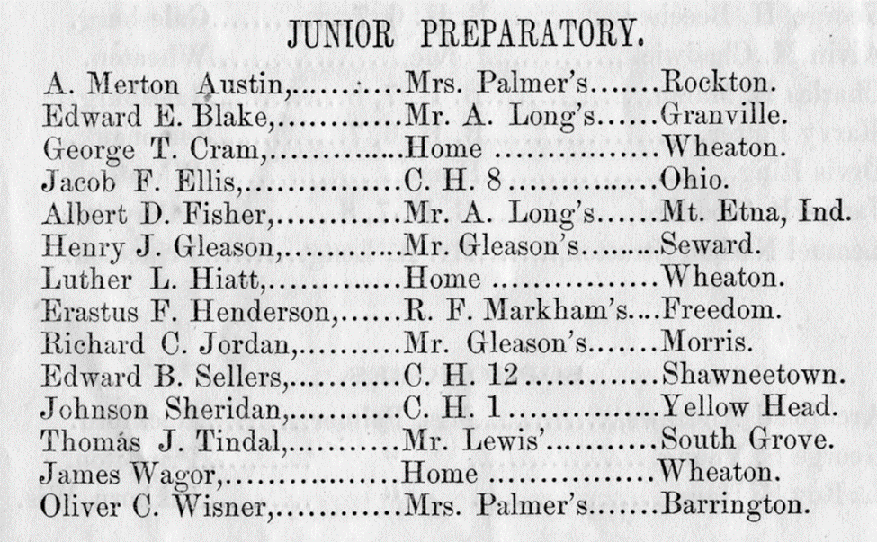 Beginning with the Wheaton College Junior Preparatory program in 1859, Edward Sellers studied in both the Preparatory and Collegiate departments and was active in student life as an officer for the Beltonian Literary Society, gaining a reputation as “one of the leading disputants” on campus. The “C.H.” listed as his residency likely refers to College Hall which would indicate that, for at least part of his education, he lived on campus.