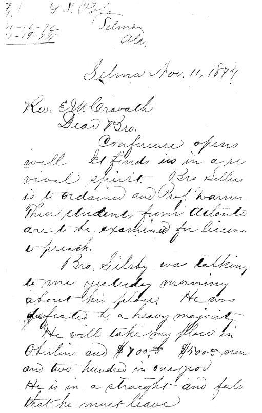 In the fall of 1874 Sellers was ordained in Selma, Alabama as a Congregational minister under the American Missionary Association (AMA). In the aftermath of the Civil War, the AMA established schools and churches throughout the South. The following letter from the AMA archives mentions Edward Sellers’ ordination, and the “revival spirit” that anticipates their imminent conference.