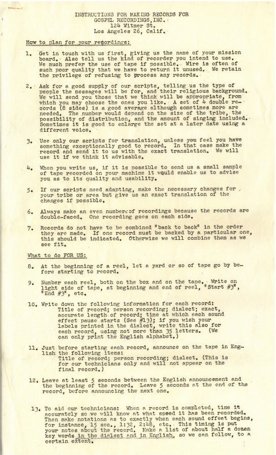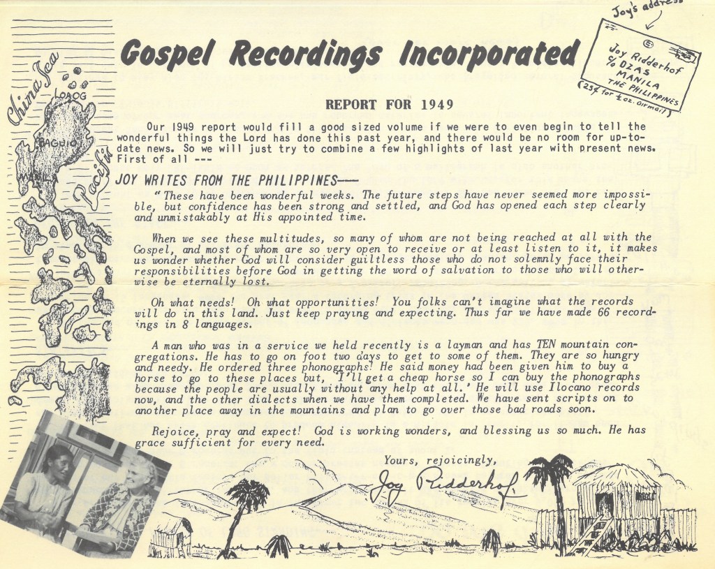 Joy Ridderhof’s story has been told in biographies like Phyllis Thompson’s Count It All Joy, and institutional histories of Gospel Recordings, like Faith by Hearing, but many of Ridderhof’s personal papers remain untouched in the archives’ holdings, and many of the documents and images featured here are located in unprocessed portions of the Gospel Recordings Records.