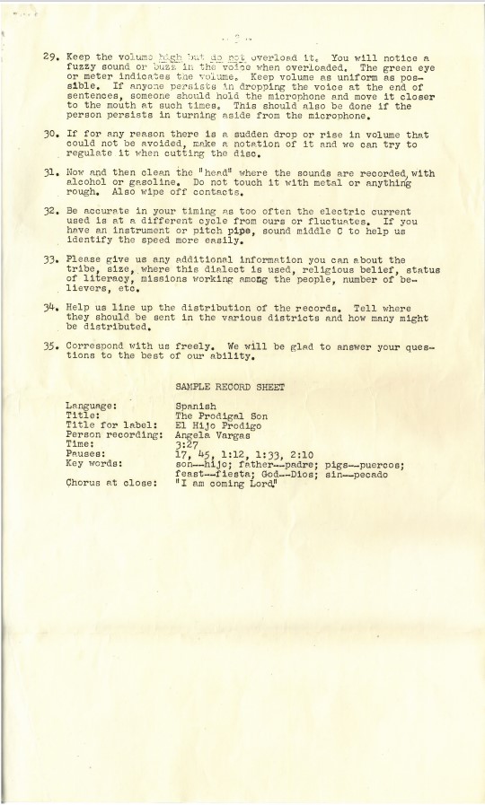 Unable to preach the gospel to Hondurans in person, Joy turned to another medium to transmit the simple gospel message—gramophone recordings. Recalling the Honduran love of recorded music and the centrality of gramophone players in village culture, Joy began taking guitar lessons and practiced singing in Spanish. With the support of fellow missionaries who had recording experience and equipment, Joy produced her first Gospel record on December 31, 1938, a three-and-a-half-minute master recording titled Buenas Neuvas composed of hymns and Bible verses in Spanish. From her attic bedroom, Joy shipped copies of Buenas Neuvas to missionaries all over Honduras and was soon flooded with requests for more recordings from Christian workers all over Latin America.