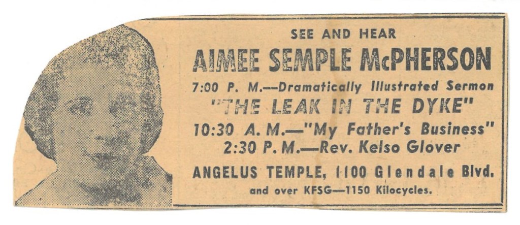 For more information on Aimee Semple McPherson’s sermons, correspondence, and clippings held in Wheaton Archives & Special Collections, browse the finding aid for Collection 103: Papers of Aimee Semple McPherson. Most of the collection consists of microfilmed copies of original documents held by The Foursquare Church. Additional materials on Angelus Temple and Aimee Semple McPherson can also be found in the Archives of Fuller Theological Seminary and the Flower Pentecostal Heritage Center.