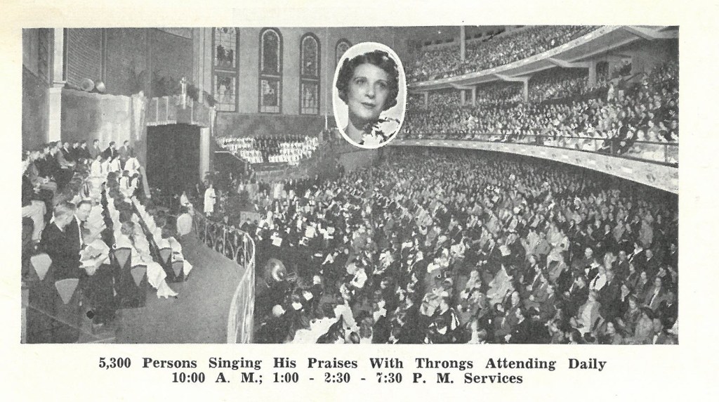 Services at Angelus Temple often included theatrical set pieces, where art, music, and drama brought the audience into a multi-sensory experience with the stories of Scripture. The hymn writer and evangelist Merrill Dunlop describes his experience of one such sermon at Angelus Temple in a 1979 oral history interview with the Archives: