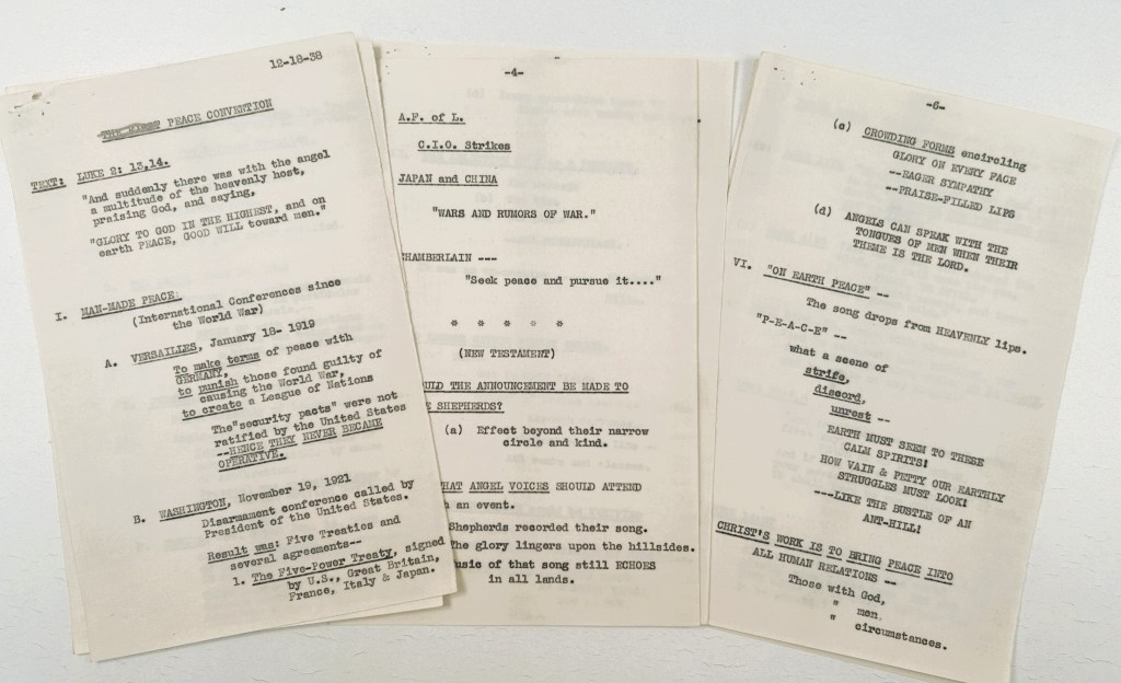 Building her ministry through the social and political earthquakes of Prohibition, the Great Depression, and the onset of World War II, Aimee Semple McPherson did not shy away from religious engagement with the secular world. During the heavily publicized Scopes Trial, she spoke out against the teaching of evolution in schools, and fought for similar anti-evolution legislation in California. After the economy crashed in 1929, she led efforts to feed and house thousands in metro Los Angeles. Following the U.S. entry into World War II, she also became one of the leading war bond sellers in the whole of California. In this 1938 sermon, Aimee Semple McPherson confronts the growing conflict in Europe in light of the Christmas message of peace. (Collection 103, Folder 25-3). Read full sermon outline here.