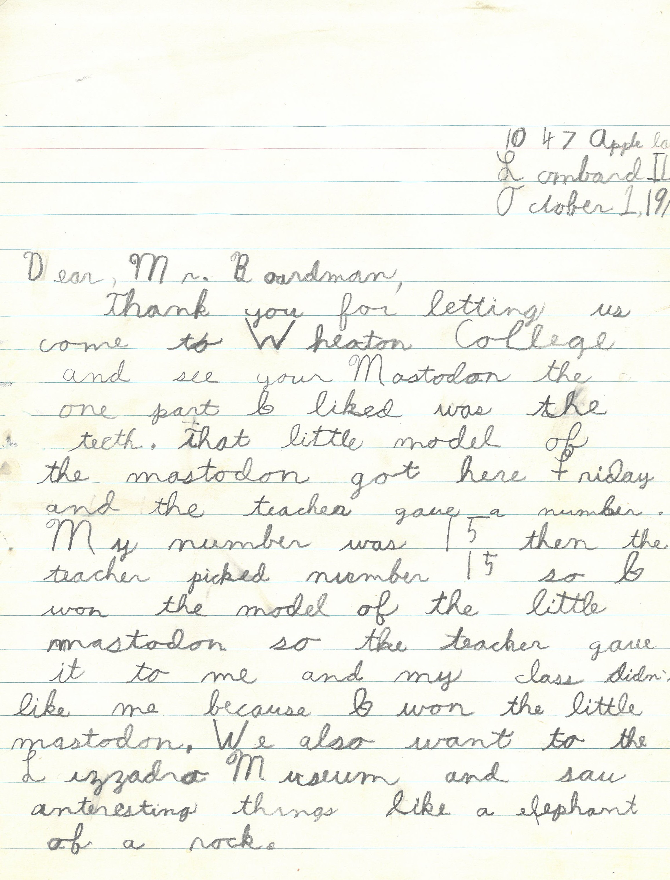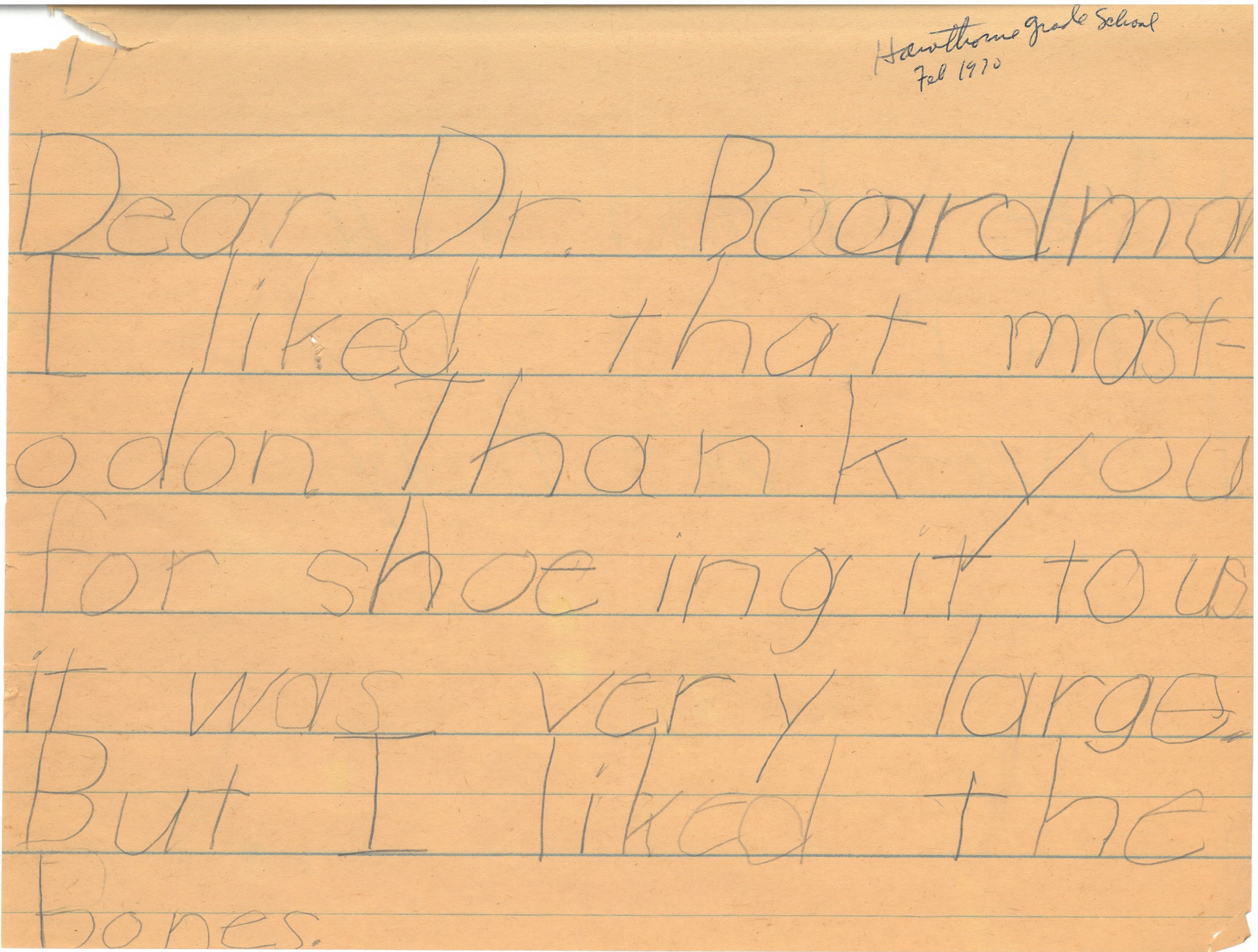Select letters and drawings given to Dr. Boardman from local children after visiting Perry Mastodon, 1967-1971. RG 10.02, Box 1, “Correspondence – Children.”