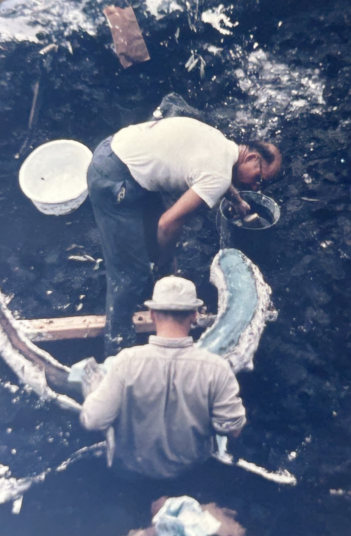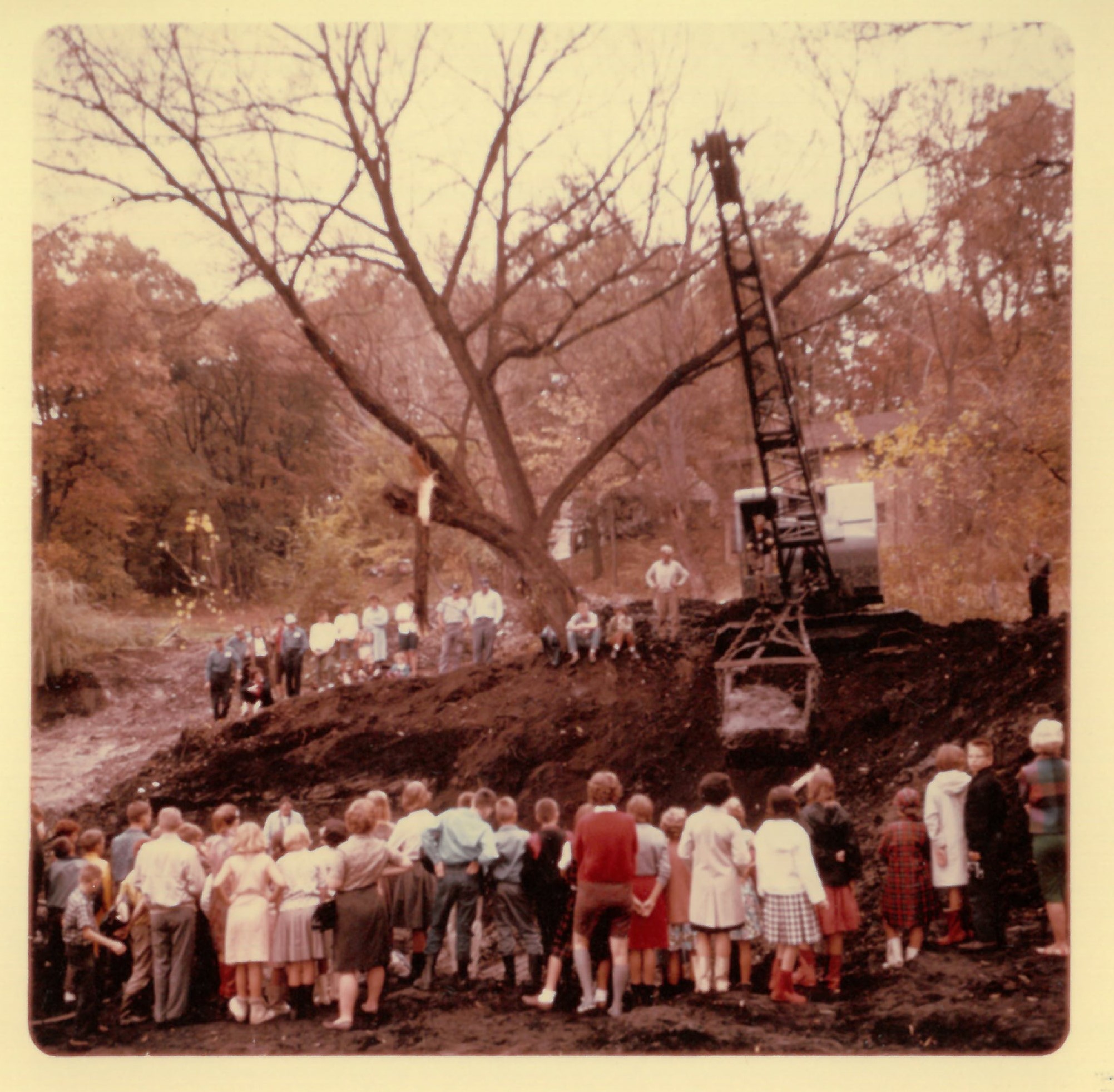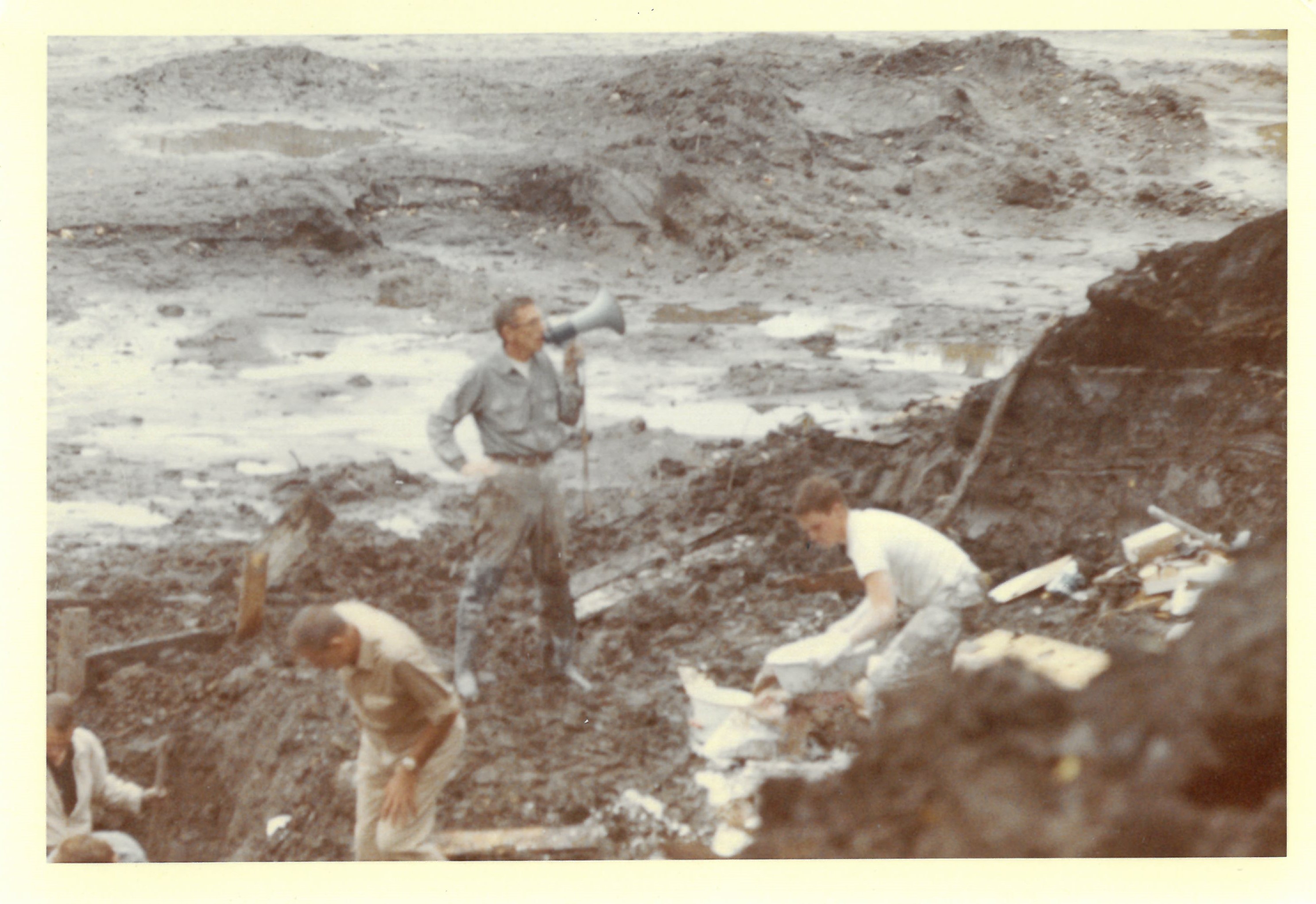 On October 16, 1963, Judge Sam Perry of Glen Ellyn, intending to merely deepen the pond on his property, received much more than he expected when diggers unearthed a prehistoric femur. Upon hearing the news, Judge Perry called for help from Wheaton College, and Dr. Douglas Block of the Geology Department took charge of the site. Judging the find to be geologically significant, the decision was made to drain the lake and excavate. Enlisting Wheaton students from the Geology Department and with technical advice from Orville Gilpin of the Chicago Field Museum, Dr. Block oversaw a strenuous eight-day dig. The muddy excavation was soon joined by hundreds of interested community members and extensive media coverage from local DuPage County and Chicago papers.