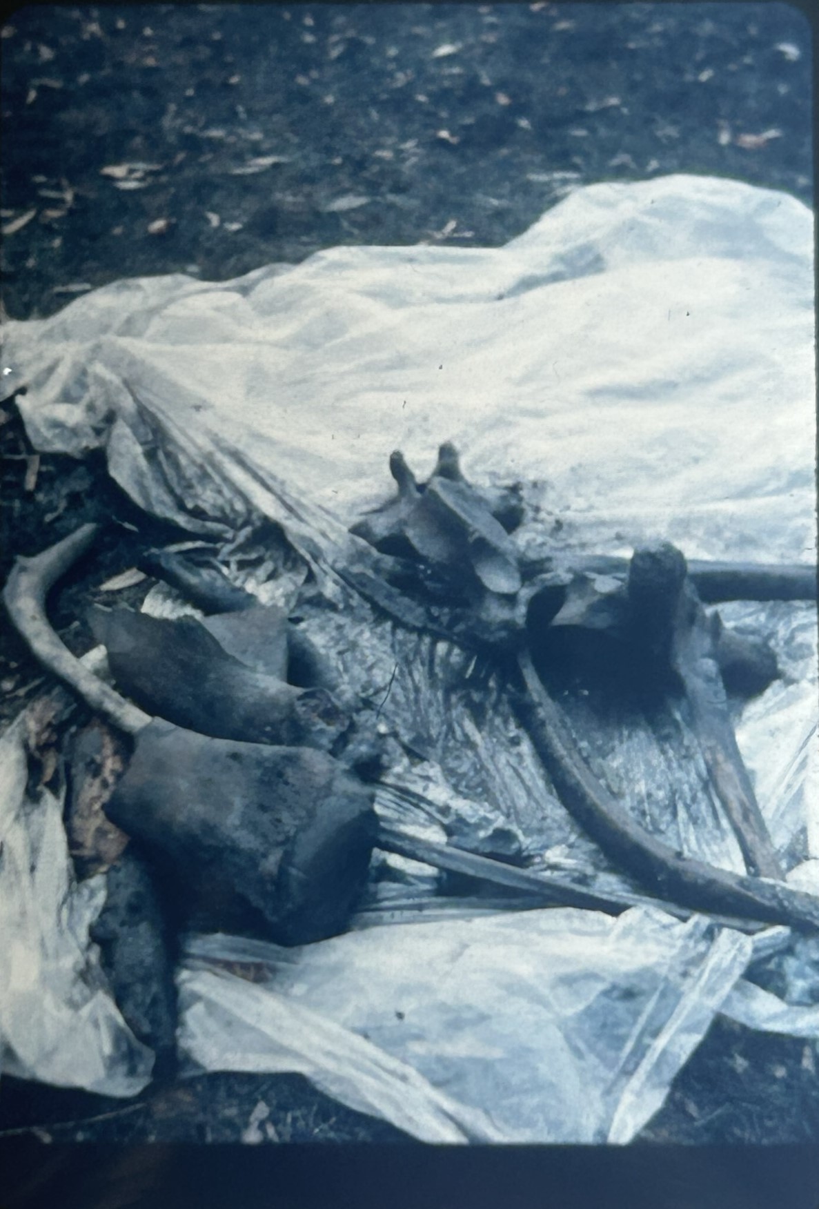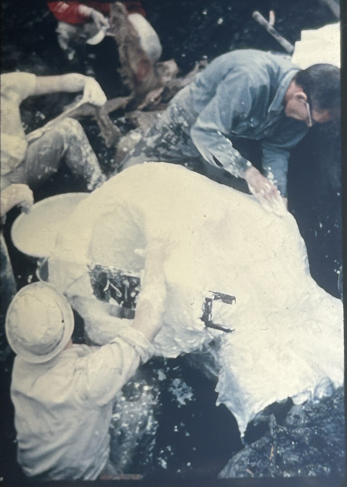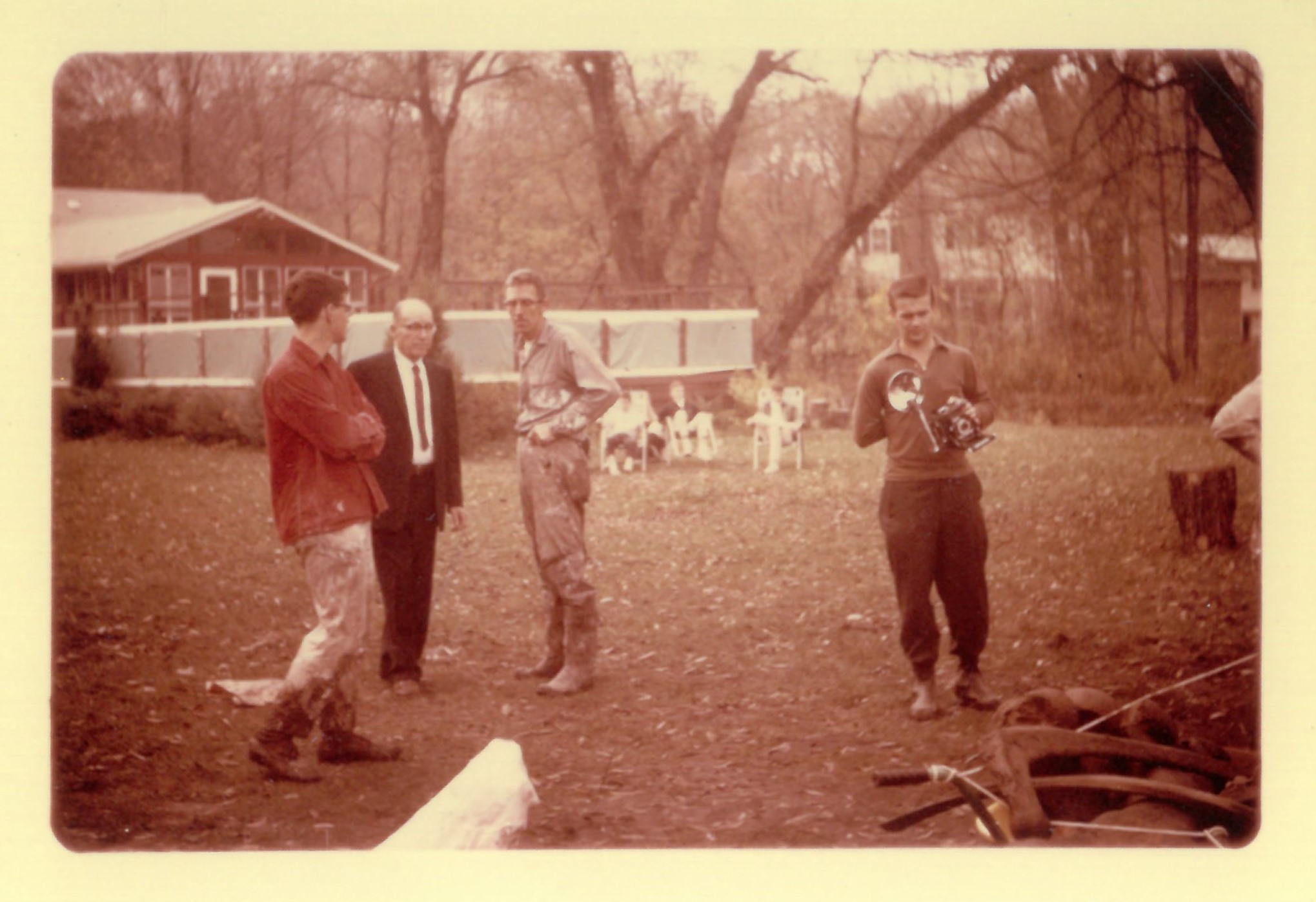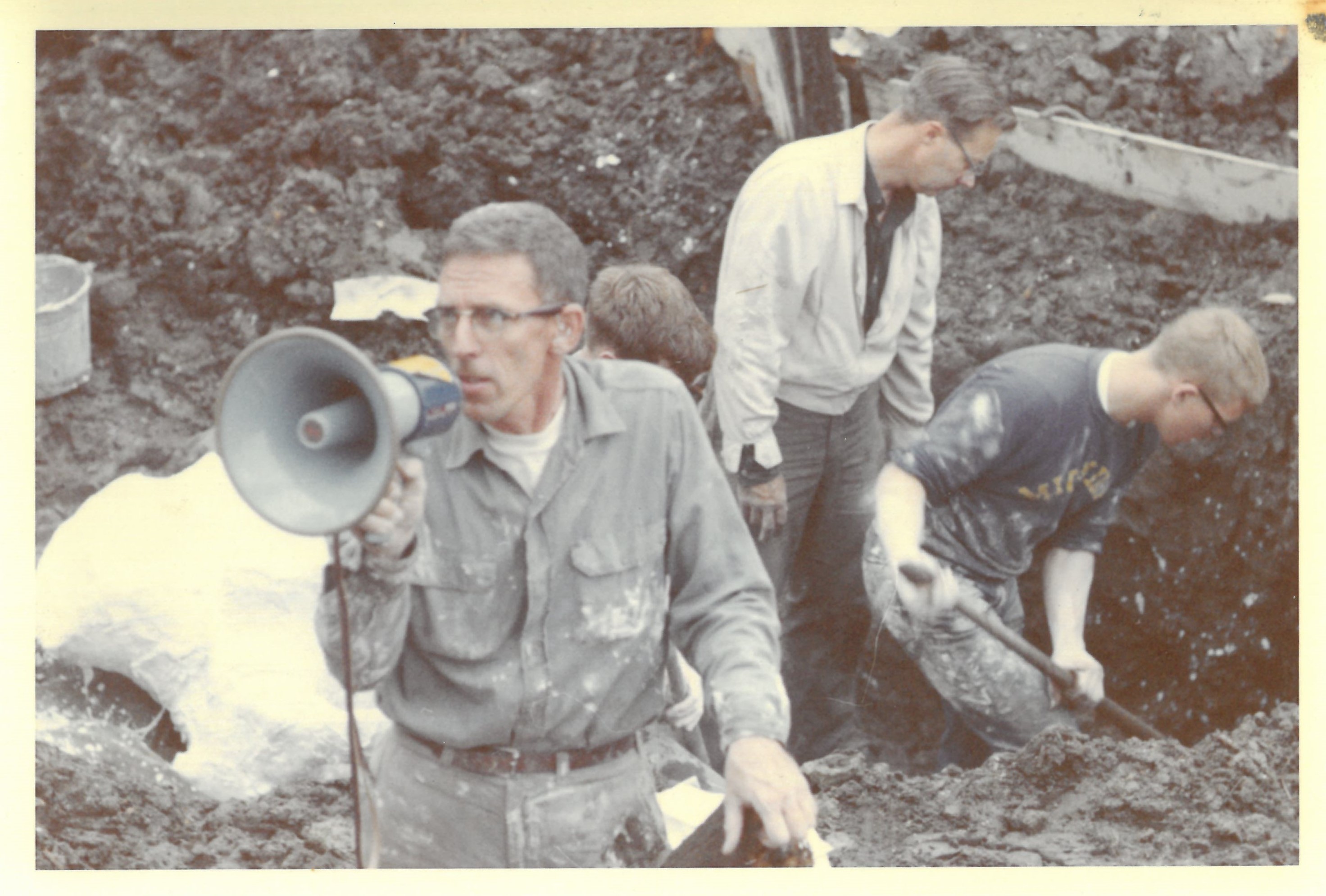 Snapshots from the excavation of the mastodon skeleton, October 1963. Pictured is Dr. Block in overalls with a megaphone, as well as several Wheaton students who assisted in the dig. Excavation involved not only uncovering the bones from the site, but also coating them in plaster for preservation and safe transport. RG 10.02, Box 4 and 5.