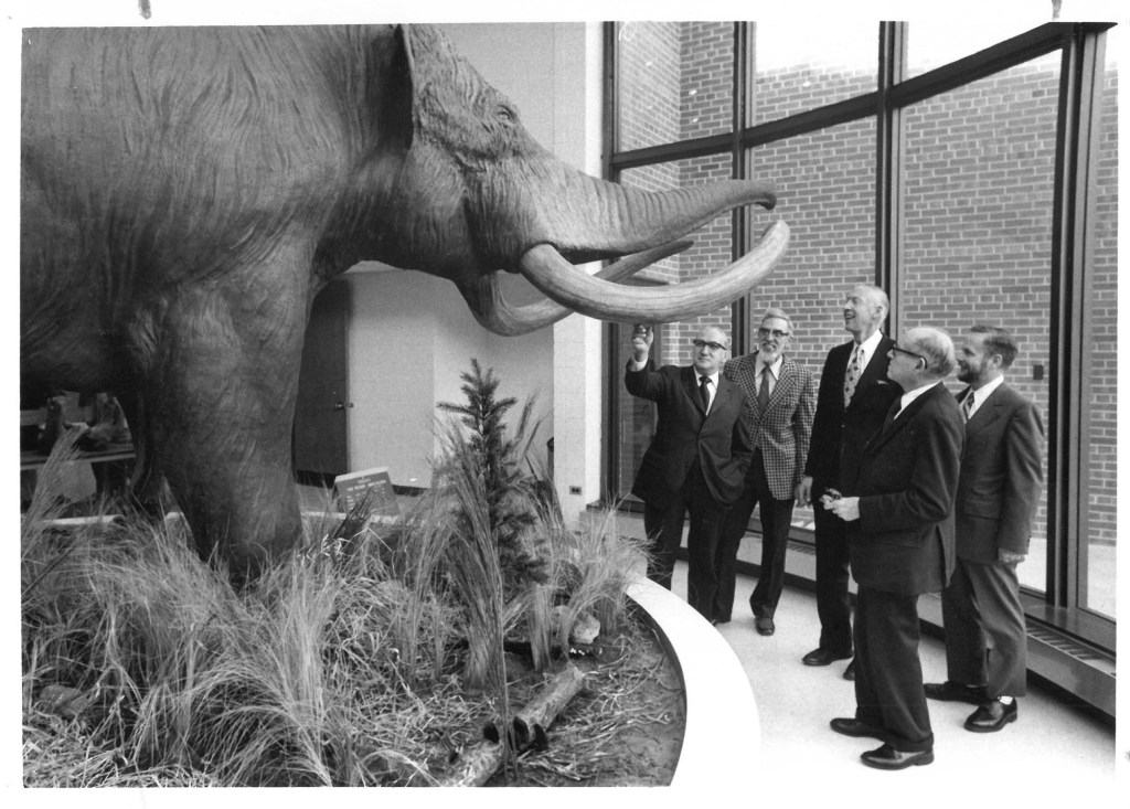 Plans for a permanent exhibit of the skeleton began soon after its discovery. With a campaign for a new science building projected for the late 1960s, the Campus Planning Committee decided to incorporate a special exhibit wing into the existing plans. Construction began on the new building in 1970, and the exhibit wing was named the Edwin F. Deicke Exhibit Hall after one of the generous financial donors who made the Perry Mastodon project possible. Leading Chicago model-maker, Richard Rush, designed and constructed the new display, which featured a rotating mount with the mastodon’s skeleton on one side and a reproduction of the imagined skin and hair on the other. After more than ten years of fundraising, construction, and painstaking restoration, Wheaton president Dr. Hudson Armerding officially dedicated the exhibit on January 18, 1975.