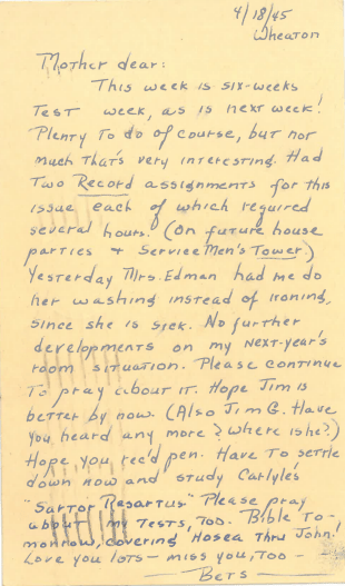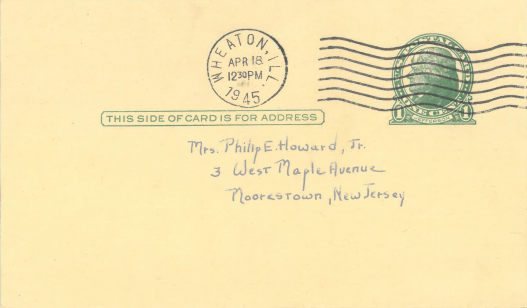 An example of an unadorned postal card, sent from Elisabeth Elliot ’48 to her mother, circa 1945. From Elisabeth Elliot’s College Archives biographical file.