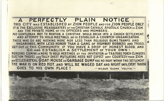 Postcard depicting a notice about the establishment of a community of the “Christian Catholic Apostolic Church in Zion” and its policy towards outsiders and non-believers. Undated, from CN 636, Binder 7