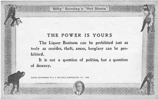 A Prohibitionist postcard featuring a quote from Billy Sunday, a popular 20th century itinerant evangelist. Undated, from CN 636, Binder 7.