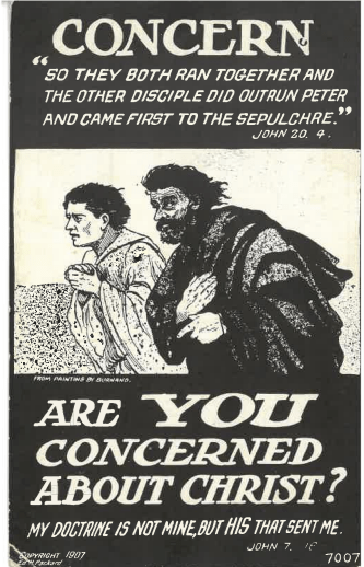 However, there are also many other postcards in the collection that are entirely apolitical. After Prohibition, evangelists, revivals, and evangelism are the second most popular subject matter of the visual half of the postcards in the collection. Billy Sunday makes a frequent appearance on many of the postcards, along with other minor evangelists. Pictures of revival meetings as well as locations of revivals are also popular. Others exhort Christians to take their faith more seriously, directly asking the reader, “are YOU concerned about Christ?”