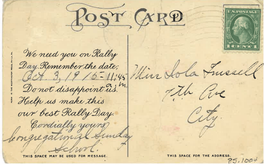 Beyond the Church’s outward facing aspects like politics or evangelism, a smaller group of postcards are interested with the more internal affairs of the church; Sunday School attendance, “Rally Days,” and opportunities for adults to attend educational meetings about their faith. This rather domestic focus, compared to the more wide-ranging messaging and possible appeal of the other postcards, suggests that twentieth-century Christians used postcards like these as a precursor to our modern texting or email—short form communication that could reliably reach its recipient in a short amount of time, and communicate a simple message or reminder.