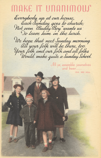 A postcard emphasizing the importance of whole family attendance at church and Sunday school attendance. Undated, from CN 636, Binder 7
